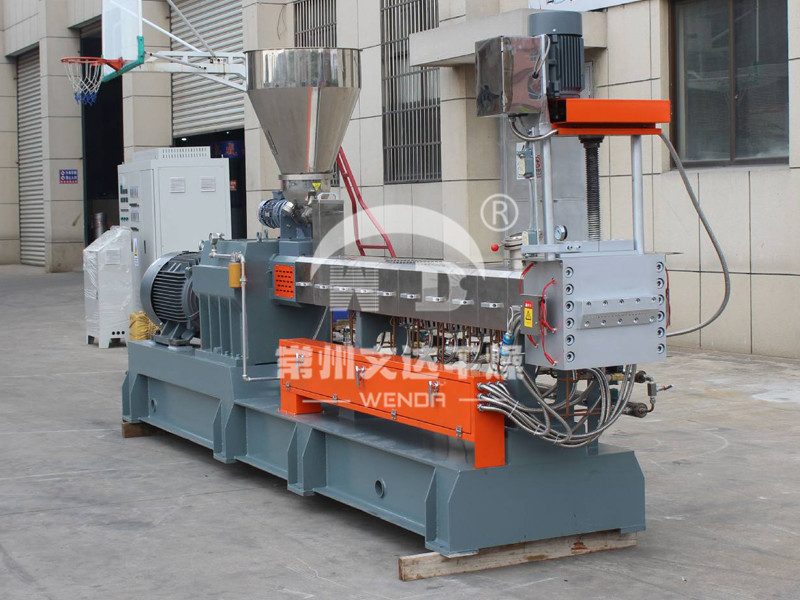 螺杆挤出造粒机为双螺杆,其挤出形式有前挤出和侧挤出二种机型。由驱动、减速、传动箱及主机等部分组成,加入主机内的湿粉状物料,在特殊设计的螺杆元件作用 下经输送压实,开压不均压过程,被送至造粒机头,并被挤出模板,形成同柱状的颗粒产品,从而达到造粒目的。由于粉状物料是在湿态下完成挤出制粒过程,使得 后续操作过程(如:干燥、包衣等)及操作条件得到大大改善。一般可减少现场粉尘量90%以上。