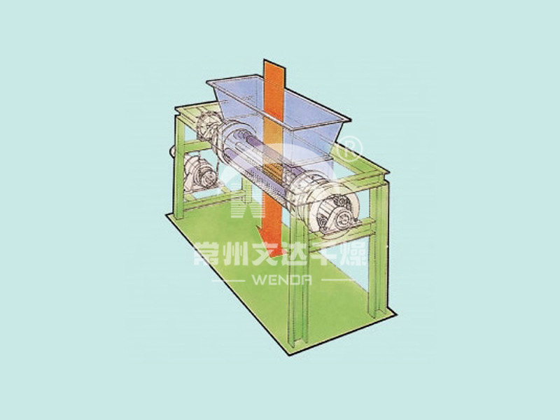 ◎槽形成型机: 由加料斗和刻有槽的二根辊子构成。以增大物料表面积的造粒为目的。物料被内侧运转的辊子吸入,被反转的外侧刮刀切成粒状。