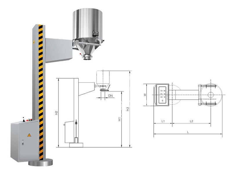 概述 TJG 系列固定提升加料机由两部分组成,即提升机及底座。提升机由机架、液压提升系统及料门翻转机构组成。工作时,先将提升机的料门与料桶扣合,启动提升操作杆,料门与料桶一起上升,启动翻转操作杆,料桶即可番转180度,呈底桶向上姿态并移动到所需位置,利用料门上出料蝶阀,可很容易将物料加入所需的工艺设备中。