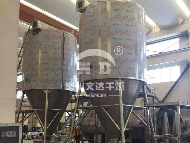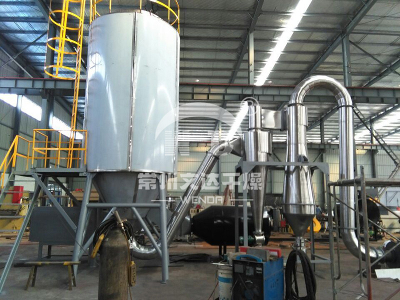 本机组工作过程为料液通过隔膜泵高压输入,喷出雾状液滴,然后同热空气并流下降,大部分粉粒由塔底排料口收集,废气及其微小粉末经旋风分离器分离,废气由抽风机排出,粉末由设在旋风分离器下端的授粉筒收集,风机出口还可装备二级除尘装置,回收率在96-98%以上。