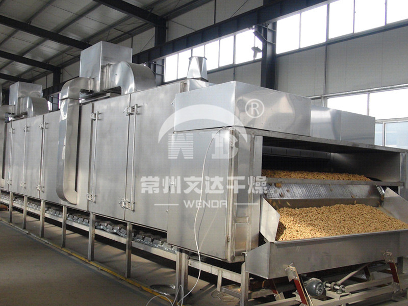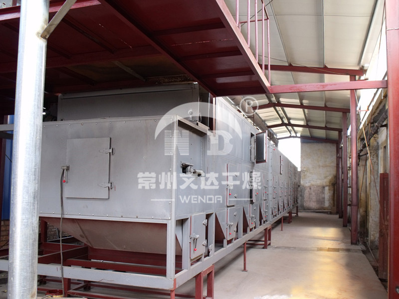 物料由加料器均匀地铺在网带上,网带一般采用12-60目不锈钢丝网,由传动装置拖动在干燥机内移动。干燥机由若干单元组成,每一单元热风独立循环,部分尾气由专门排湿风机排出,废气由调节阀控制,热气由下往上或由上往下穿过铺满物料的网带完成热量与质量传递的进程,带走物料水份。网带缓慢移动,运行速度可根据物料温度自由调节,干燥后的成品连续落入收料器中。上下循环单元根据用户需要可灵活配备,单元数量亦可根据需要选取。