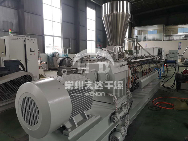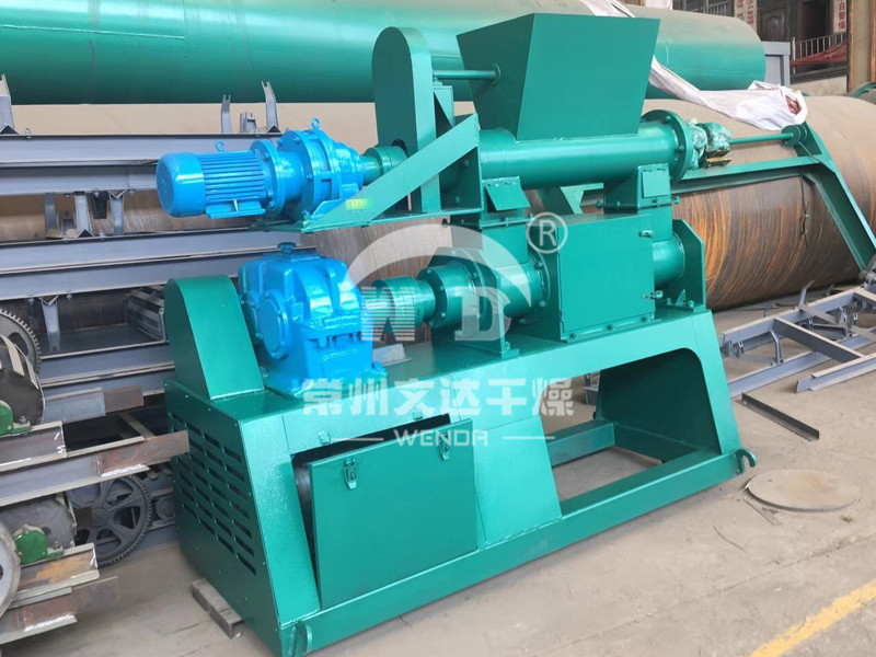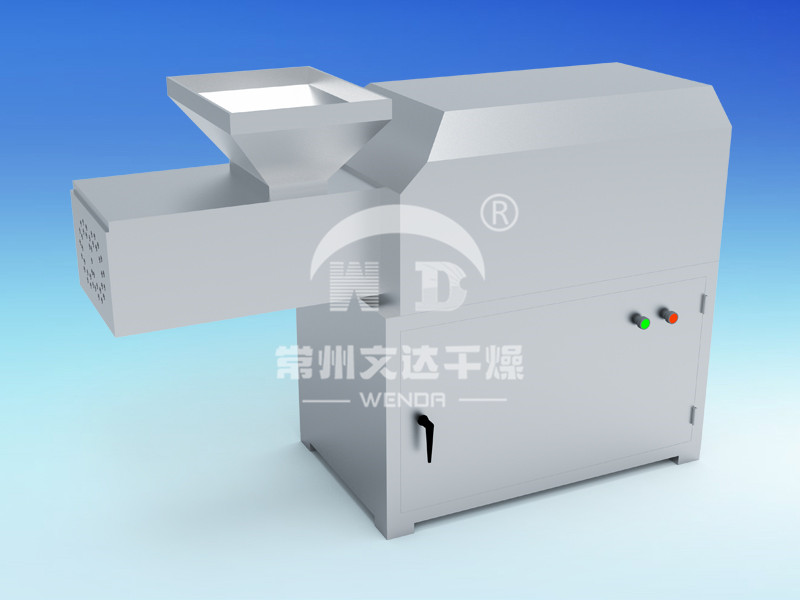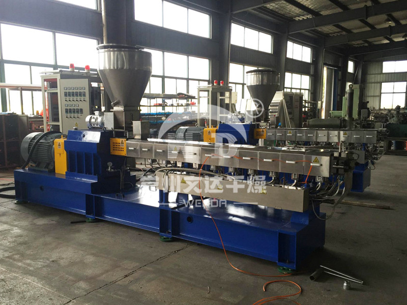 螺杆挤出造粒机为双螺杆,其挤出形式有前挤出和侧挤出二种机型。由驱动、减速、传动箱及主机等部分组成,加入主机内的湿粉状物料,在特殊设计的螺杆元件作用 下经输送压实,开压不均压过程,被送至造粒机头,并被挤出模板,形成同柱状的颗粒产品,从而达到造粒目的。由于粉状物料是在湿态下完成挤出制粒过程,使得 后续操作过程(如:干燥、包衣等)及操作条件得到大大改善。一般可减少现场粉尘量90%以上。