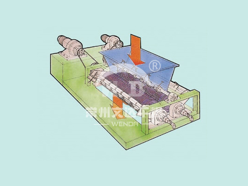 ◎槽形成型机: 由加料斗和刻有槽的二根辊子构成。以增大物料表面积的造粒为目的。物料被内侧运转的辊子吸入,被反转的外侧刮刀切成粒状。