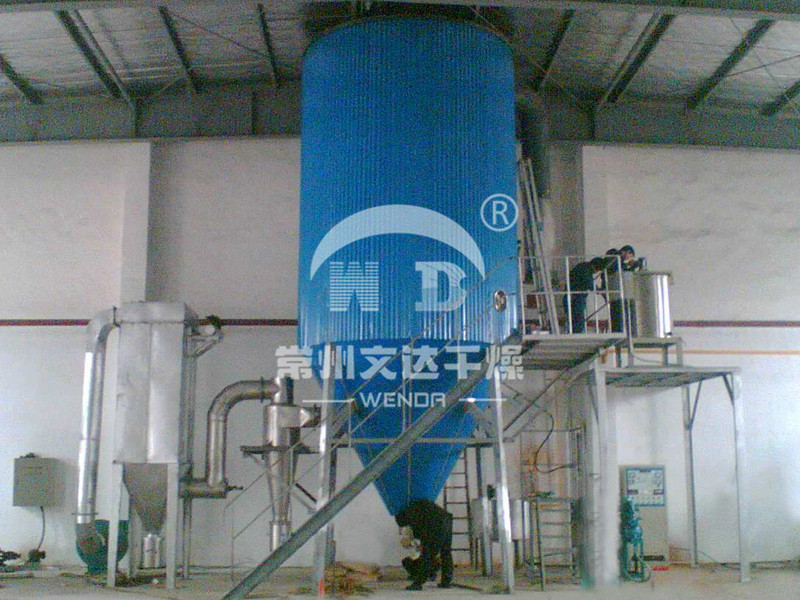 本机组工作过程为料液通过隔膜泵高压输入,喷出雾状液滴,然后同热空气并流下降,大部分粉粒由塔底排料口收集,废气及其微小粉末经旋风分离器分离,废气由抽风机排出,粉末由设在旋风分离器下端的授粉筒收集,风机出口还可装备二级除尘装置,回收率在96-98%以上。