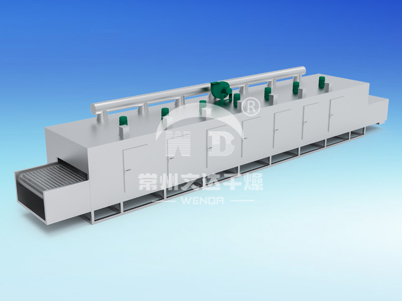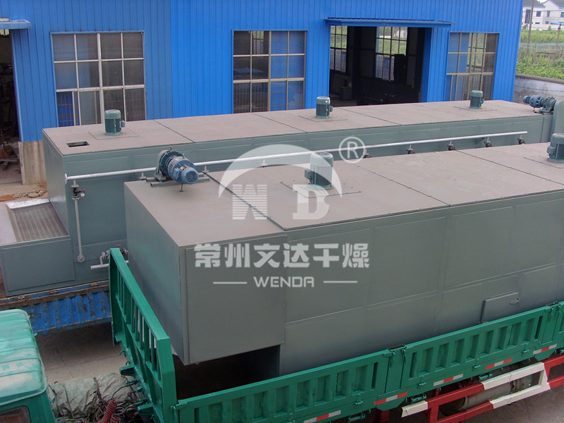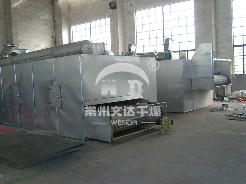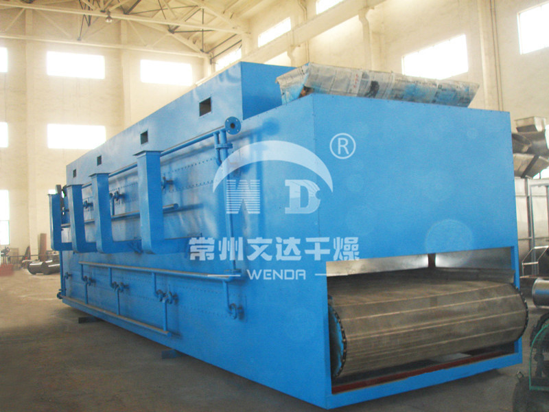 物料由加料器均匀地铺在网带上,网带一般采用12-60目不锈钢丝网,由传动装置拖动在干燥机内移动。干燥机由若干单元组成,每一单元热风独立循环,部分尾气由专门排湿风机排出,废气由调节阀控制,热气由下往上或由上往下穿过铺满物料的网带完成热量与质量传递的进程,带走物料水份。网带缓慢移动,运行速度可根据物料温度自由调节,干燥后的成品连续落入收料器中。上下循环单元根据用户需要可灵活配备,单元数量亦可根据需要选取。